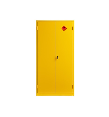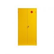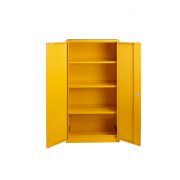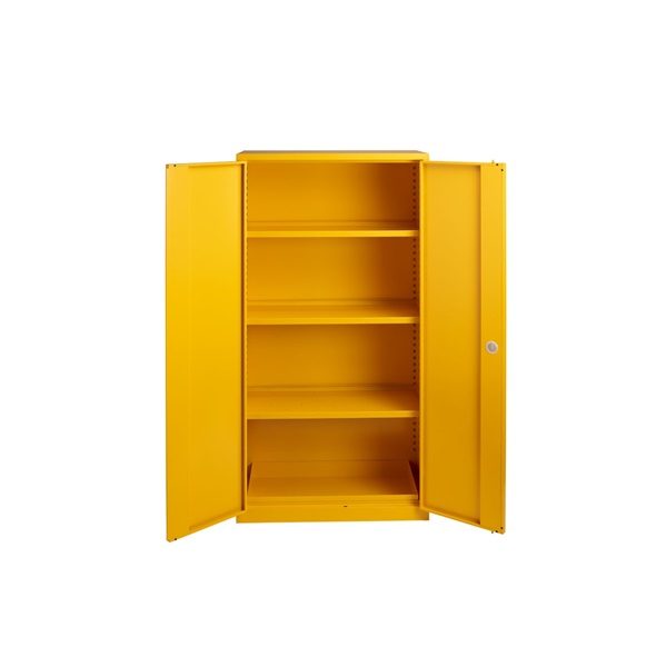 High quality, medium duty, flammable liquid storage cabinet of welded and riveted construction with adjustable shelves, sump tray and reinforced lockable doors.