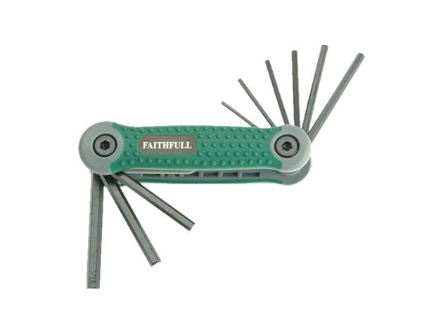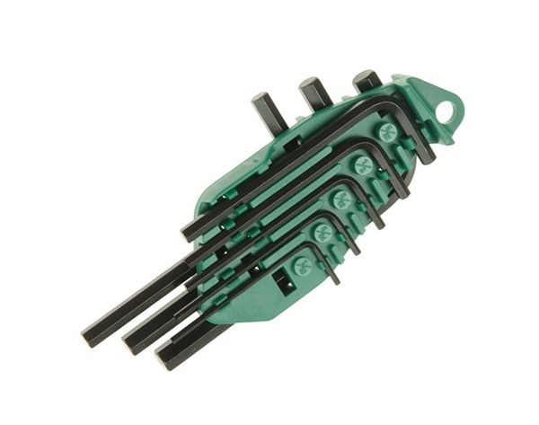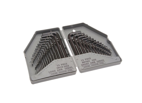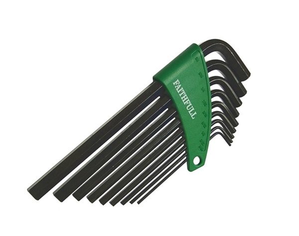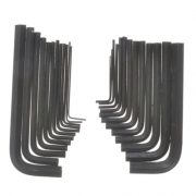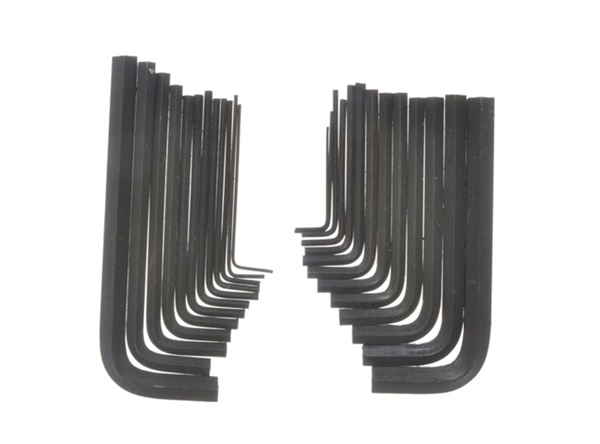 15 standard length metric hexagon keys: 0.7, 0.9, 1.3, 1.5, 2, 2.5, 3, 4, 4.5, 5, 5.5, 6, 7, 8, 10mm