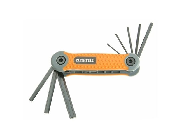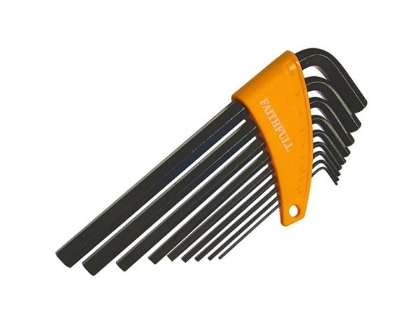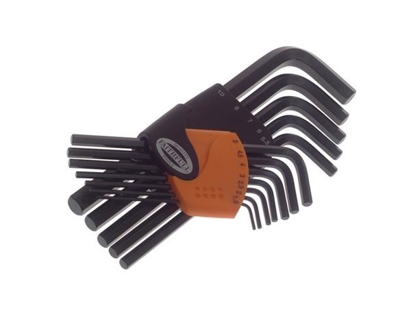 15 standard length metric hexagon keys: 0.7, 0.9, 1.3, 1.5, 2, 2.5, 3, 4, 4.5, 5, 5.5, 6, 7, 8, 10mm