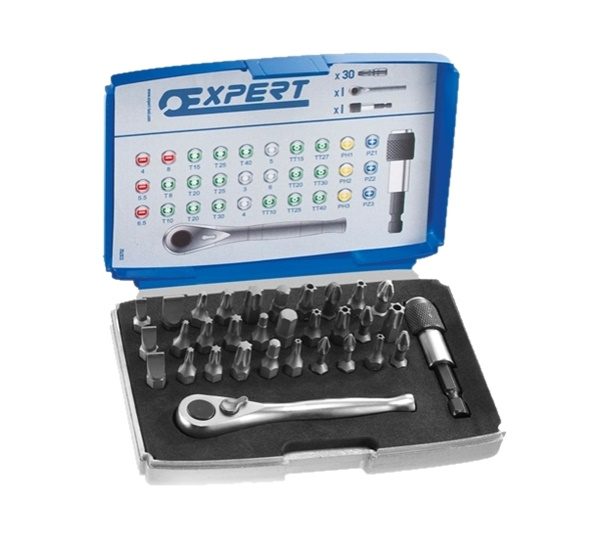 • 1/4" mini ratchet and magnetic bit holder (with locking ring) complete with: